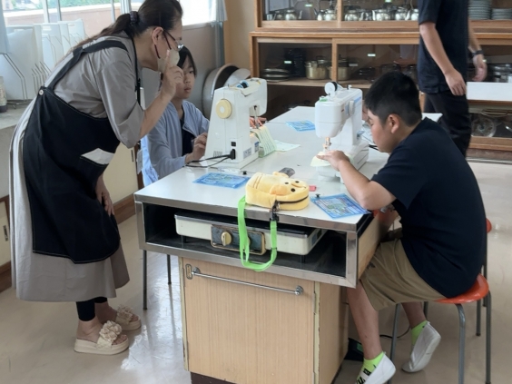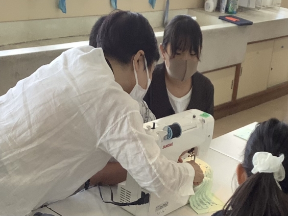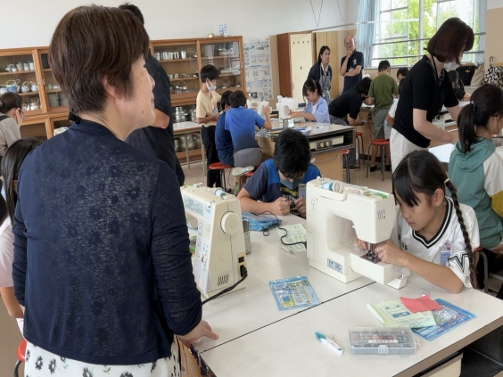 9月16日・18日に中央地区公民館のご協力で、ミシンボランティアの方から5年生のミシン学習をお手伝いしていただきました。前回の6年生は、これまでにミシンの学習を重ねた上での制作活動でしたが、5年生はこの時間が初めてのミシンの学習となります。基本的な使い方から丁寧に教えていただきました。