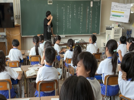 初めにクイズを出し合う交流では、子供たちから「簡単なクイズになっちゃった」という声が上がり、先生と一緒にどんなクイズにすると難易度を上げられるか話し合いました。「なぜ〜」や「なんで〜」からクイズを始めることで、より難しいクイズにすることができるとわかり、改めて自分のつくったクイズを見直していました。
