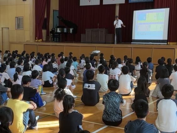 校長先生のお話の中では、前期に挑戦できたことについて振り返りました。学習面や生活面はもちろん、各行事や休み時間の過ごし方、登下校の様子など、さまざまな場面で「やさしい子・かしこい子・たくましい子のスーパースター」が見つかりました。4月より明らかに増した輝きを胸に、後期は何に挑戦したいか考える式となりました。