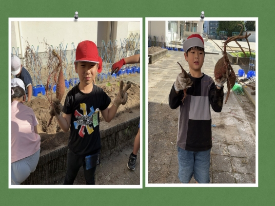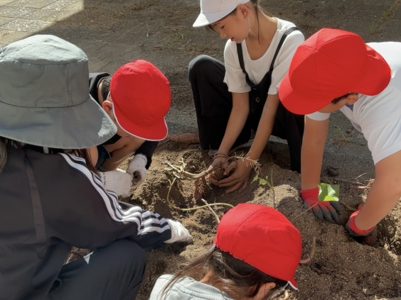 特別支援学級の子供たちがおいもを掘っていました。この日までに水やりなどのお世話を続けて、丹精込めて育てたさつまいもです。 初めからツルやいもをいきなりつかんで抜くのではなく、いもの周りの土を丁寧に掘っていました。こうすることで、わったり傷めたりせずに掘ることができるようで、子供たちは苦労しながら、いもの周りを掘り進めました。だんだんいもの姿が見えてくると、いもを優しく掴んで掘り出すことができました。 「やったー!」と言いながら、収穫したいもを笑顔で見せてくれました。