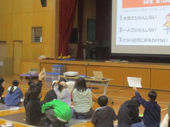 12月10日(水)に、5年生の総合的な学習の時間の一環で、「防災教室」が行われました。大牟田市役所の防災危機管理室から講師をお呼びし、地域の方にも多数ご参加いただいて行われました。