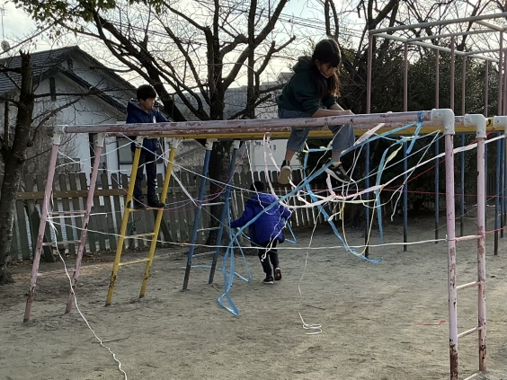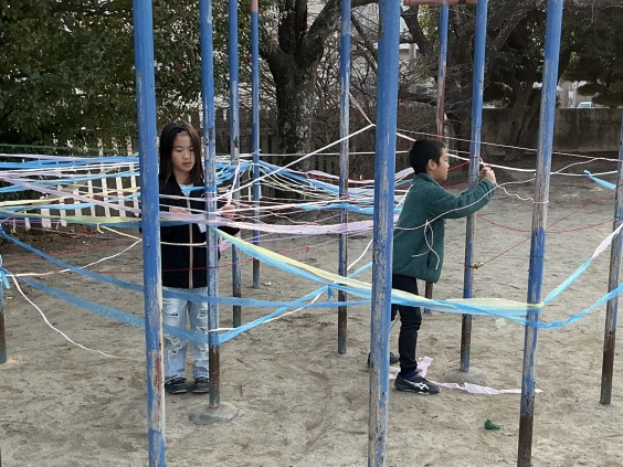 3年生が運動場で図画工作科「ひもでつないで」で、ひもをつなぐことで身近な場所の様子を変える活動に取り組んでいました。 狭い範囲を彩っているグループや、広い範囲で平面に張り巡らせているグループ、高いところにつないで迫力を出しているグループなど、自分たちで表し方を工夫していました。普段体育科の学習や休み時間の遊びで使っている身近な場所に、ひもを使って働きかけることで、友達同士で発想を連ねることができました。 協力して学習したことで、素敵な場所に変身させることができましたね。