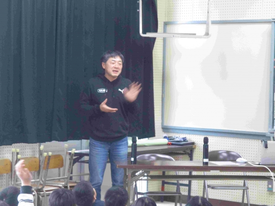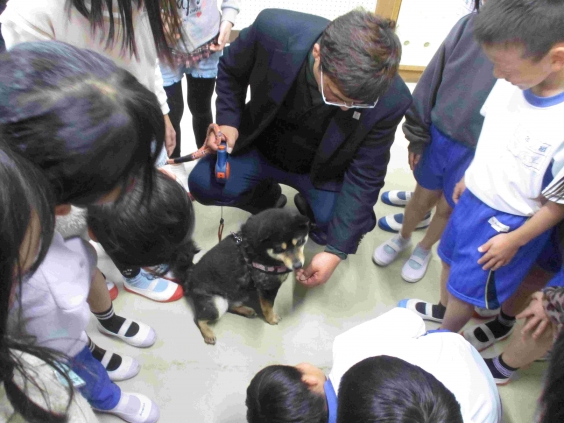 芝田様からは、「ワンヘルス」の理念について、4年生の子供たちに向けて分かりやすく教えていただきました。芝田様の体験や保護犬、保護猫の活動を通して感じられたことなど聞くことができました。里親が見つからない動物は、殺処分される話を聞いた子供たちは、しんと静まり返り悲しそうな表情をしていました。話の最後には、サプライズが2つありました。1つは「いのちスケッチ」や「オオムタアツシの青春」の映画監督である瀬木直貴さんの登場でした。もう1つは、お話の中で出てきた犬との触れ合いでした。子供たちは、とても驚き、喜びいっぱいの表情でした。