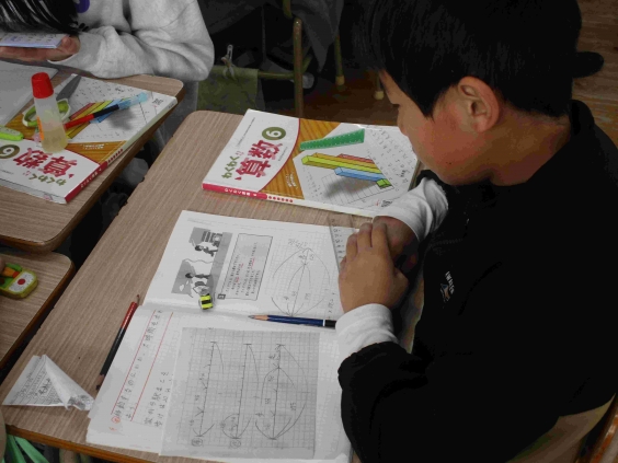 1月16日(金)3時間目に、6年2組で算数「見方・考え方を深めよう」の授業が行われました。この授業のねらいは、移動するのにかかった時間を求める場面において、全体の割合や1分間に進んだ割合について着目し、線分図や式、言葉などを関連付けながら話し合う活動を通して、移動するのにかかった時間の求め方を追求することです。難しい内容ですが、子供たちは果敢に挑戦していました。グループや全体の中で、自分の考えを友達と共有していく中で、答えにたどり着いていました。