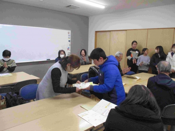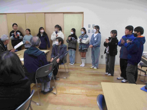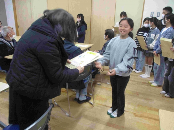 1年生との昔遊びの後に、給食試食会を行いました。メニューは、牛乳、ハヤシライス、グリーンサラダでした。調理員さん手作りのハヤシライスに「とてもおいしいです。」と、うれしい感想をいただきました。毎日、おいしい給食を作ってくださる調理員さん方に感謝です。 給食試食会の後、全校児童から子供見守り隊の方への感謝のメッセージを送りました。見守り隊の方のおかげで、子供たちは毎日安全に登下校できています。本当にありがとうございます。また、ご多用の中、給食試食会にご参加いただきありがとうございました。