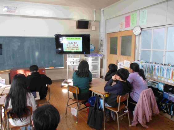 校長先生からは、1月の子供たちのがんばりの振り返りを話していただきました。「たくましい子のスーパースター」では、持久走大会であきらめずに最後まで走った子供たちの姿を紹介していただきました。また、今期は、次の学年の0期であるので、これまでよりも「一つ上の目標を立てて挑戦すること」の大切さを話していただきました。