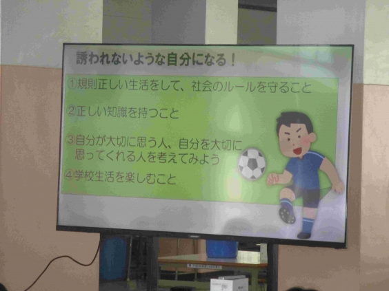 子供たちは、先生のお話を真剣に聞くことができていたようです。誘われない自分になることや相談する勇気と断る勇気を持つこと等、とても大切なことを教えていただきました。