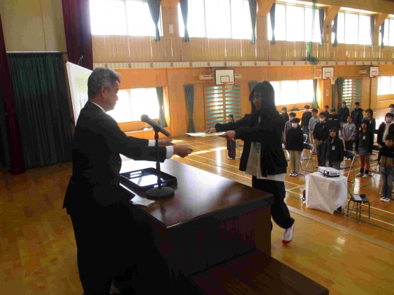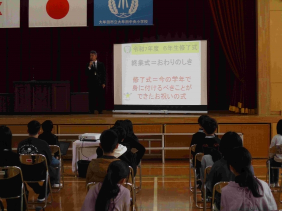 3月17日(火)に6年生の修了式を行いました。はじめに6年生の代表児童に、修了証の授与を行いました。その後の校長の話では、これまでの6年生の頑張りと成長を伝え、明日は、「失敗を恐れず、自分で納得できる卒業式」にしてほしいと伝えました。