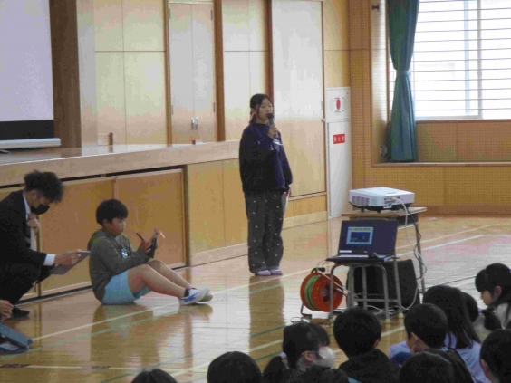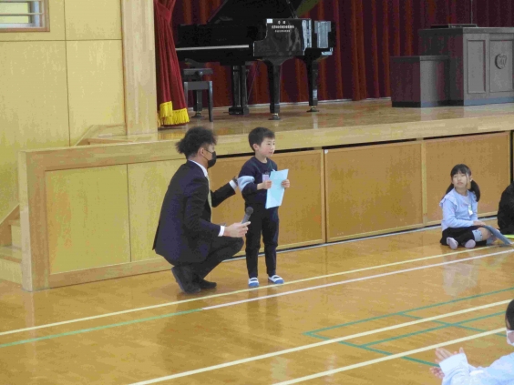 全校児童を代表して5年生の子供に修了証が渡されました。校長の話では、1年間の「やさしい子のスーパースター」「かしこい子のスーパースター」「たくましい子のスーパースター」の振り返りをしました。また、1年間頑張ったことの発表では、全校児童の前で、大きな声で堂々と発表することができました。1年間を振り返り、できるようになったことが増えたことを喜んでいました。
