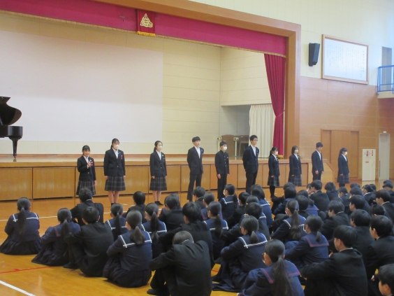 明けましておめでとうございます。 3学期が始まりました。始業式では、校長先生から「目標を持って、気持ちを新たに挨拶など基本的なことから頑張りましょう。」とお話をしていただきました。全校集会では、新生徒会役員の着任式が行われました。 地域の皆様、保護者の皆様、今年もご支援ご協力のほどよろしくお願いいたします。