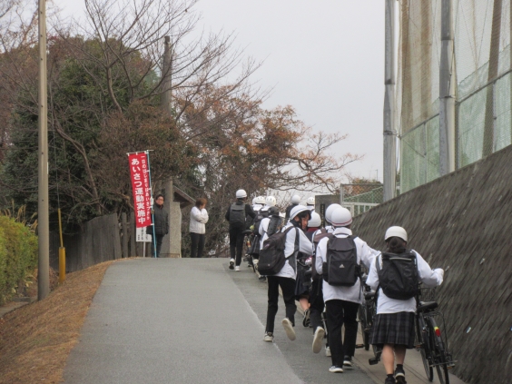 PTAあいさつ運動を行いました。今日はとても寒い朝でした。ご参加いただいた保護者の皆様ありがとうございました。今日は、生徒会も昇降口から参加しました。 通学の自転車の様子です。まだまだご心配をおかけしておりますが、左側1列通行を頑張っています。