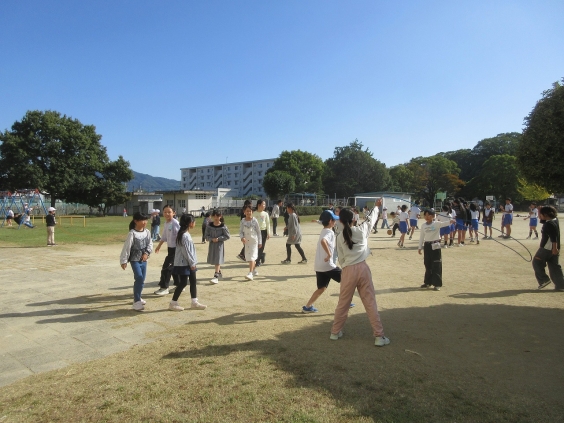 今日も秋晴れのとてもいい天気でした。 昼休みの校庭では、学年を超えて一緒に楽しく縄跳びやサッカーをする姿がありました・・・ 幸せな学校です。 この後、チャイムが鳴り、後5分休み時間があるよね〜???と騒然となりました・・・