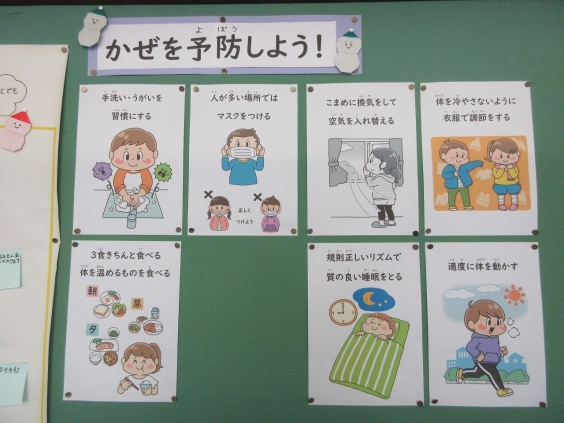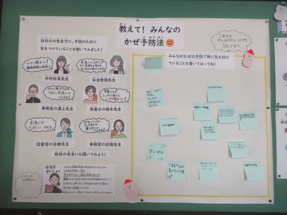 現在、白川小学校もインフルエンザが流行っている状況です。 体調が悪くならないために、みなさんはどのようなことを心がけていますか? 保健室前には、先生方がどんな対策をしているか、インタビューをした内容を掲示してあります。手洗い、マスク、しっかり食べる、睡眠時間をとるなどなど・・・ この冬も元気に乗り越えたいですね!
