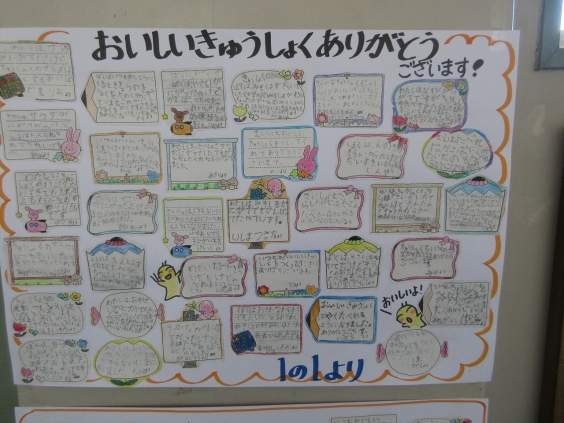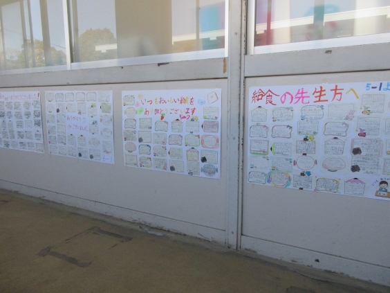 給食室の前には、各クラスで作成した給食の先生方への感謝のメッセージが掲示してあります。