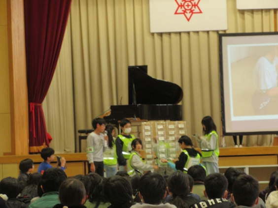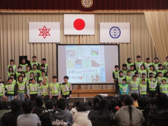 6年生は、一年間取り組んだジュニア民生委員の活動報告でした。インタビュー形式でどんな取り組みをしたかを発表しています。ごみ拾いチーム、残食ゼロチーム、ベルマークチーム、あいさつチーム、新聞作りチームのそれぞれがよりよい地域、よりよい白川小学校となるよう、そして笑顔を届けることができるように取り組んだ様子がよくわかりました。
