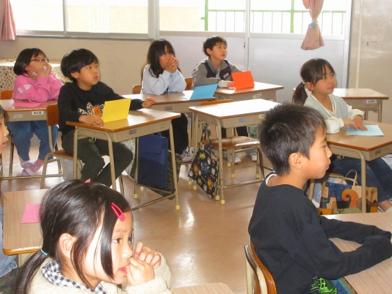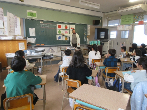 低学年も色やくだものの英語表現に親しみながら、好きな色やくだものを質問し合っていました。