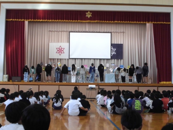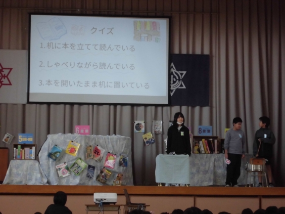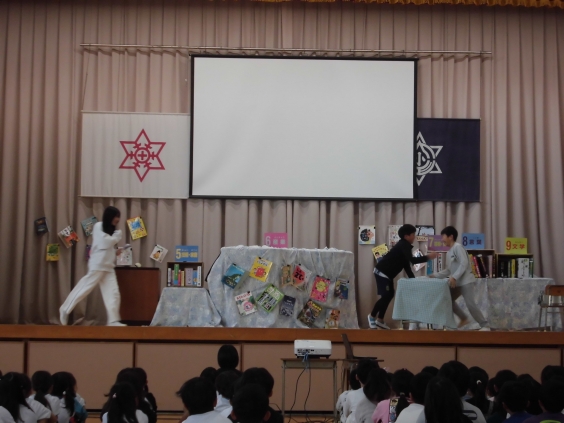 本日(11/6)、児童集会で図書委員会からの発表がありました。 現在、読書週間(10/27〜11/7)ということもあり、図書室の使い方や本の扱い方等の内容を劇にして発表しました。みんなが楽しく見れるような工夫もあり、図書委員会の皆さんの練習の積み重ねがよくわかる発表でした。本には映像とは違う良さがあり、想像力も育まれます。今回の図書委員会の発表をきっかけにたくさんの本に親しんでほしいです。