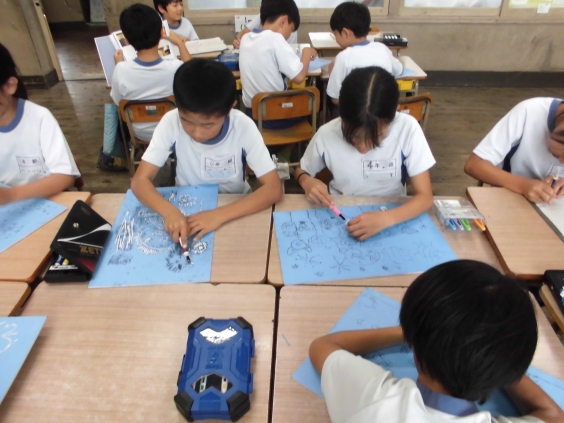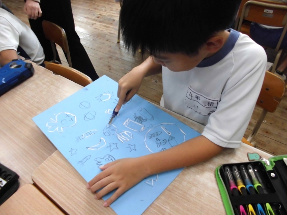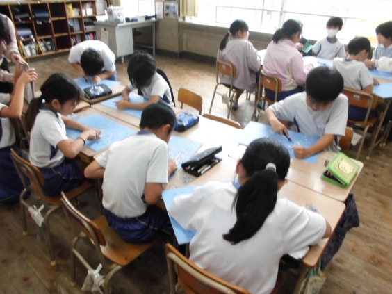 本日(11/13)、4年生で版画の学習が進められていました。 多色彫りに挑戦しています。絵の構想を練り、それを板に写しとりました。三角刀の彫刻刀を使って線彫りをしていきます。写した線に沿って丁寧に彫り進めていきました。事前に学習した彫刻刀の使い方を確認し、持ち方、反対の手の置き方、彫り方、板を回しながら彫る等、安全に気を付けました。世界一つだけの作品ですから丁寧に仕上げてほしいです。