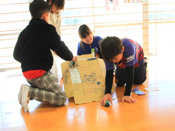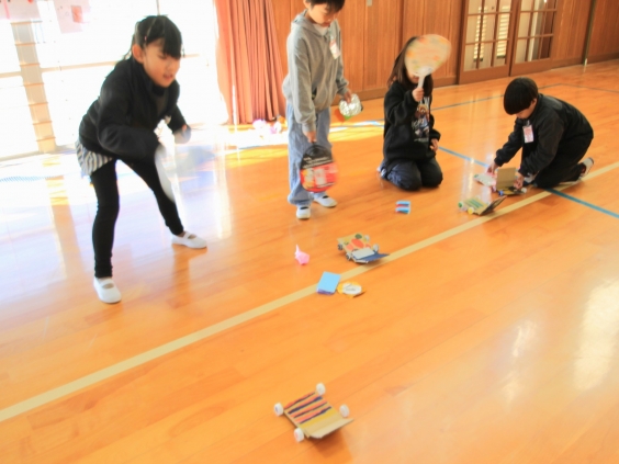 2年生がおもちゃをつくり、1年生を招待しておもてなしをすることになりました。全部で5つのブースに分かれて、それぞれおもちゃを工夫しました。「ピョンコップ」「パッチンジャンプ」「コトコト車」「ヨットカー」「コロコロコロン」の5種類です。一つ下の後輩たちが全力で楽しめるように、遊び方の説明や、実演してみせることなど、わかりやすくするための工夫を考えて、この日のためにたくさん練習してがんばりました。実際に喜んでいる1年生の姿を見て、達成感を味わうことができました。2年生の皆さんの相手意識の高さがこのおもちゃランドを大成功させた一番の要因です。とても頼りになるお兄さん、お姉さんの姿を見せてくれました。