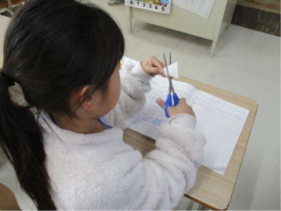 2年生は算数の時間に「三角形と四角形」という学習をしています。 これまでに、三角形は3つの直線で囲まれた形、四角形は4つの直線で囲まれた形ということを学んできました。 そこで、今日は三角形に直線を1本引いて2つに分けた形を調べました。 子供たちは実際に三角形を切って、その形を見て「三角形」や「四角形」ができたと発言していました。 辺の数や頂点の数に着目しながら三角形や四角形を弁別できるようになった時間でした。