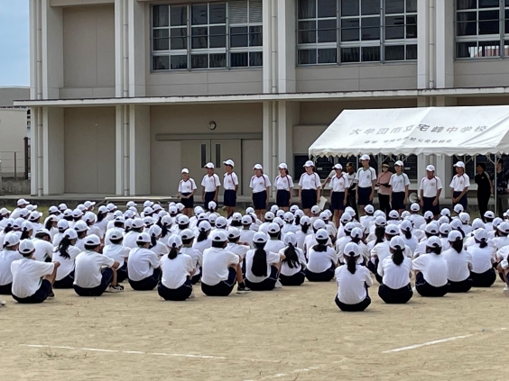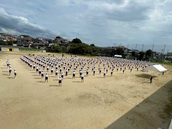 9月13日(水)午後、第1回の全体練習が行われました。全体練習では、日程確認や担当教師のあいさつ、体育会実行委員長・副委員長のあいさつ等を行った後、実行委員長(生徒会長)の指揮のもと、体育会での整列隊形と整列時の動作確認、集団体操の実技(全校生徒によるラジオ体操)を行いました。 約1時間の全体練習でしたが、中学校の体育会に初めて参加する1年生も含め、かけ声をかけながら一つ一つの動作を確認していく姿が見られました。