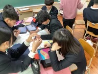 2年生は1月の修学旅行に向けて京都での班別学習計画を立てています。自分たちの班で学習できることを意識しながら見学先の候補を出し合いながら、交通機関や見学時間など、地図で確認したり、インターネットで調査したりしながらルートを計画しています。途中での食事やお土産などもあり、効果的に周れるように協力して考えています。