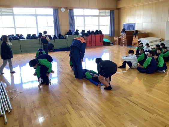 1年生の総合学習は、防災訓練をしました。消防の協力を得て、災害で起きる煙の体験、毛布担架の搬送、救命措置、応急手当て訓練など、各グループに分かれ順番に体験していきました。煙の体験では、本当に煙で前が見えなく壁伝いに行くことが大事だと実感していました。日常はできない貴重な体験となりました。