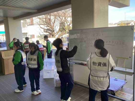 運営役は体育館に避難者の受付窓口やテント、段ボールベッドの設置などを手際よく行いました。また、避難者役には高齢者、妊婦、足の不自由な方など様々な避難者を想定した役を設定し、避難者から体調を聞き取りながら誘導したり、支援物資を搬入したりするなど、実際の災害を想定しながら主体的に取り組んでいました。