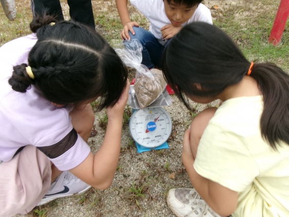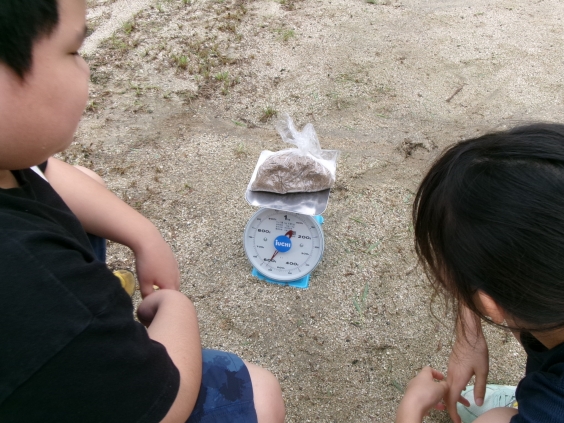 算数科の「重さ」「長さ」「かさ」などの学習では、実際の大きさについて体験を通して実感すること、つまり「量感を養うこと」がとても大切です。この学習では、砂場へ行き、グループの友達と相談しながら1kgと思う量の砂を袋に入れ、はかりに載せて重さを量りました。「あれ、はかりの針が一周してしまった。」「1kgって意外と重いなあ。」などの声が聞かれ、一人ひとりが1kgを持って重さを体感しました。