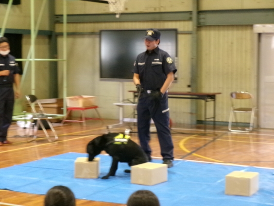 はじめに、税関や薬物の種類・依存性などについて、スライドを用いて詳しく教えていただきました。最近では、SNSのやり取りから薬物の乱用へつながるケースがあることを知りました。次に、麻薬探知犬によるデモンストレーションを行っていただきました。犬の特性を生かして見事に薬物を見つけ出す姿に、みんなびっくりしていました。