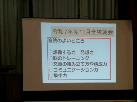 はじめの言葉の後に校歌斉唱、そして校長先生の話がありました。校長先生からは、重点目標と3つの構え(身構え・物構え・心構え)についての話がありました。その中でも特に「心構え」について触れられ、悪口なので友達にいやな思いをさせていないか、正しい言葉遣いができているかなどについて確認をされました。また、10日(月)から始まっている「家庭学習強調週間」についても話がありました。家庭学習の「音読」には、5つの良さがあることを伝えられました。