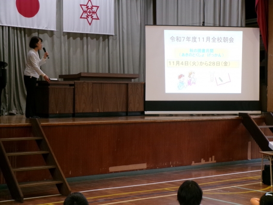 11月4日(火)の朝の時間に、体育館で全校朝会が行われました。