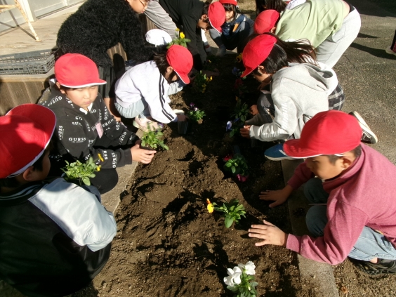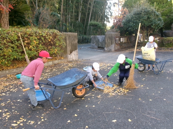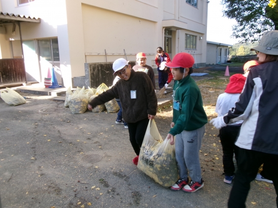 本校の児童と宮原中学校の生徒、保護者や地域の皆様と一緒に清掃活動をしました。低学年は、校内の落ち葉拾いや苗植えを行いました。中学年は、学校の周辺の落ち葉やごみを拾いました。高学年は、学校の北側を中心に、ごみ拾いをしました。そのグループに中学生が加わりました。保護者や地域の方々は、体育館を中心に清掃を行っていただきました。コミュニケーションを取りながら一生懸命落ち葉やごみを拾いました。