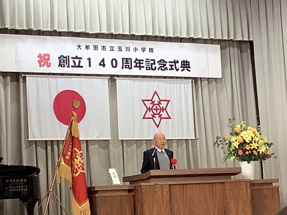 来賓の皆様から祝辞をいただいたり、記念品の贈呈が行われたり、全校合唱や校歌斉唱を行ったりしました。厳粛な中に式典は進んでいきましたが、全校合唱で子供たちの歌声が聞こえると一気に暖かい雰囲気になりました。玉川小学校の歴史の重さを感じるとともに、豊かな自然に囲まれて地域と共に歩んできたことが再確認された式典になりました。