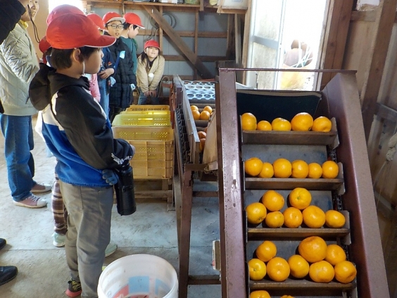 農園では、木にたくさんのみかんが実っている様子を見て、子供たちは、ワクワクしている様子でした。3年生の社会科の学習の発展で、みかんがどのように育てられているのか、どのように収穫されているのか学習をしました。農園では、みかんの栄養について、みかんづくりの工夫について、おいしいみかんの選び方についてなどたくさん話を聞きました。みかんの摘み方を教わり、収穫体験もさせていただきました。その後、選果場にも案内していただきました。