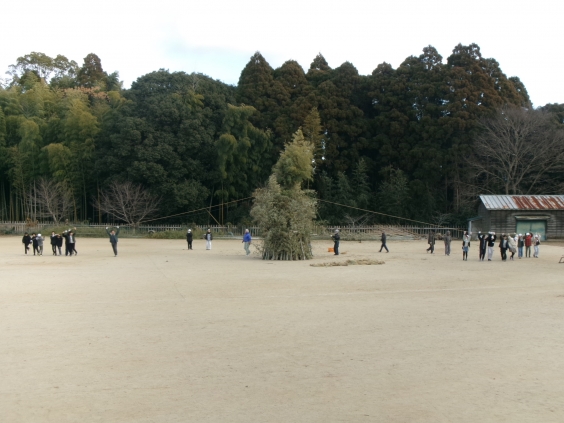 子供たちは、左右から縄を引っ張り、どんど祭の山づくりを地域の方と一緒に行いました。今年で32年目になる玉川どんど祭は、米はかり踊りの披露や太鼓の演奏やどんど山の点火など、様々なイベントが行われて毎年とても賑わっています。どんど祭は、地域と学校で玉川校区を元気づける行事を作ろうと始まったお祭りです。当日は、大人山も加わり、迫力がさらにアップするようです。