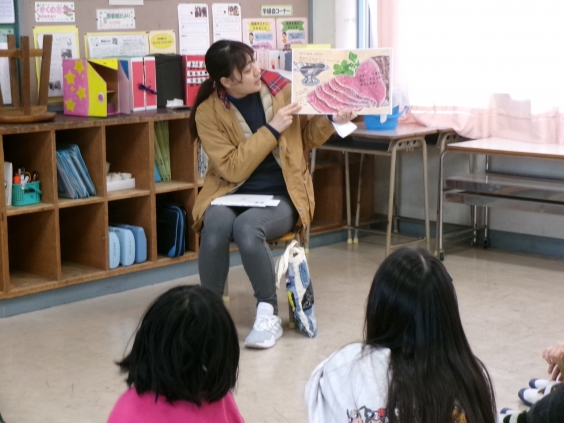 読み聞かせの際は、季節の行事や食べ物などに関する本を選んで読んでいただくことが多いです。今回は、節分にちなんで「おに」が登場する本や、2月9日の語呂に合わせて「肉」に関する本など、子供たちが楽しめる本を読んでいただきました。また、教科書の物語文と同じ作者の本や、大牟田市出身の童話作家である内田麟太郎さんの本など、子供たちにとってなじみのある方の本も読んでいただきました。