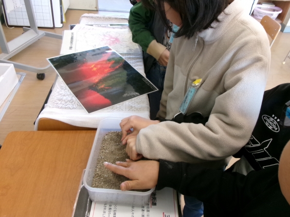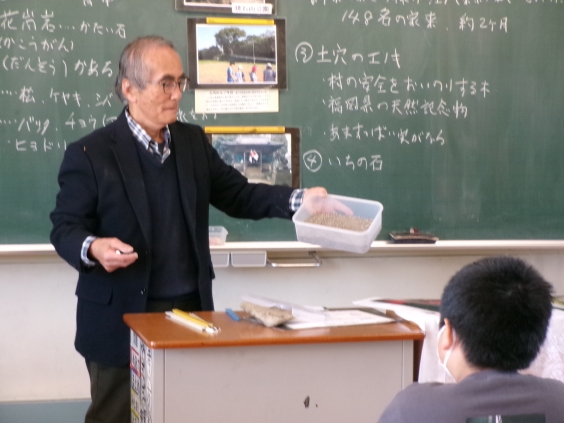 玉川の宝として、主なものを4つ紹介していただきました。1つ目は、焼石山です。焼石山は、自然が豊富でたくさんの植物や昆虫などが生育していることを知りました。2つ目は、三池街道です。江戸時代に島原藩の大名などが通っていた道だということを知りました。3つ目は、土穴のエノキです。樹齢500年で県の天然記念物となっている木で、村の安全をお祈りしていたということを知りました。4つ目は、いちの石です。9万年前に阿蘇山が噴火した時にできた石であることを知りました。話を聞いた後、子供たちは、たくさん質問して内容を深めることができました。