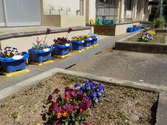 3月も半ばになり、風は冷たいですが、春の訪れを感じます。 校舎前の花壇では、1年生のスナップエンドウやビオラ、2年生のパンジーやキャベツ、そしてチューリップが咲きはじめました。今年は少雨なので、子供たちは毎朝水やりを頑張っています。 来賓玄関前では、福祉施設から苗を購入したキンセンカが次々に花を咲かせ、見ごろを迎えています。