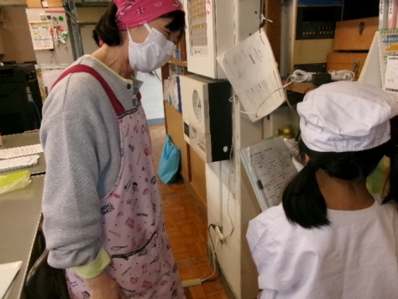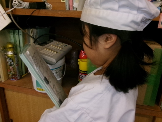 給食室前では,本日の給食献立について給食委員が栄養素ごとに絵カードを張り付けていきます。また,給食時間が始まると,給食委員が給食を食べる際の心構えや食べ方について放送します。今日の内容は「食事の環境を整えよう」でした。 初めて放送を担当する児童は事前に何度も練習して,1年生にも伝わりやすくするためにゆっくりそしてはっきりと放送するように努力しています。この放送を教室では全員が静かによく聴いている様子は本年度の重点目標である「よく聴いて,考える力の育成」の姿につながっています。