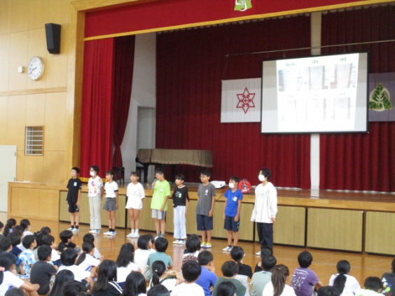 本日、児童集会が行われ、広報委員会から活動の様子について発表がありました。発表では、クイズ形式にしたり動画を流したりしながら、工夫してみんなに伝えることができました。