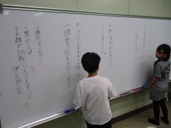 本日は、代表委員会を行い、運動会のスローガンを話し合いました。各学級から出されたアイディアを計画委員会が中心となってまとめていきました。どんなスローガンが出来上がるのか、とても楽しみです。