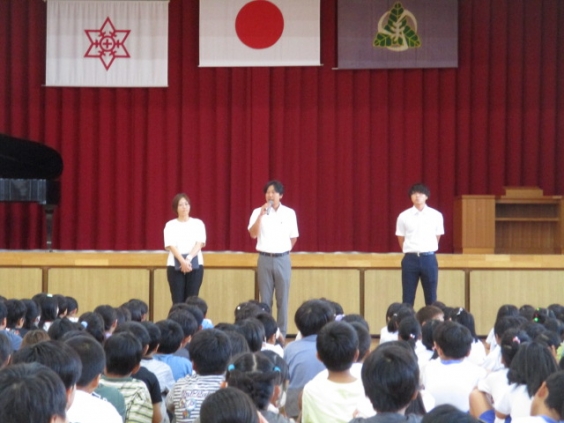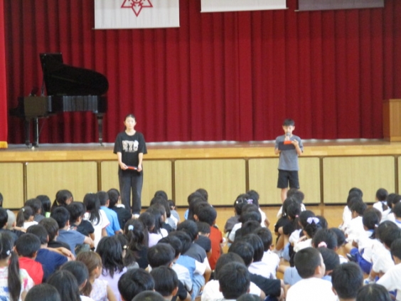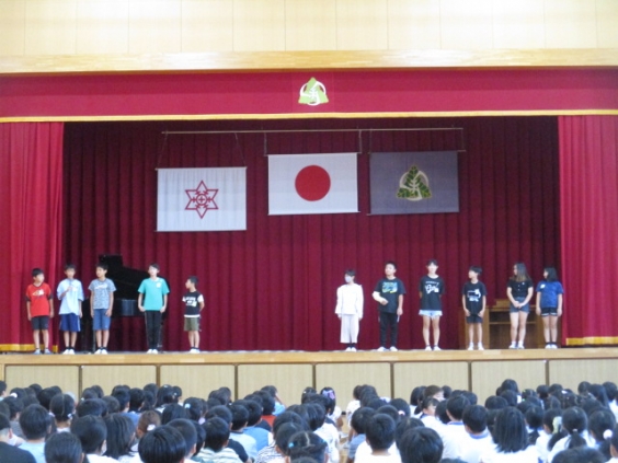 9月30日(火)、後期の始業式を行いました。新しい学期のスタートです。式の中で、6年生の代表児童が、後期に頑張ることを発表しました。他の子供たちも、自分のめあてをしっかりともって、目指す自分の姿に向かい、努力を続けてほしいと思います。 始業式後には、集会委員会から今月のめあてについて発表がありました。また、知・徳・体それぞれの担当の先生より、合言葉「元気・本気・笑顔」に関する取組についてお話がありました。