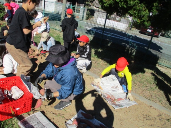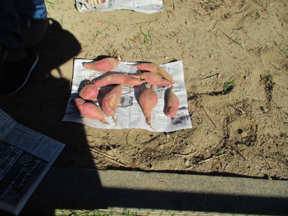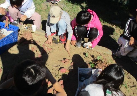 手鎌小学校では、毎年、地域の方にご協力いただきながら1年生がサツマイモを育てています。今日は、そのサツマイモを収穫しました。とっても美味しそうなおいもでした。
