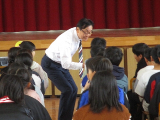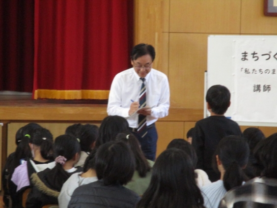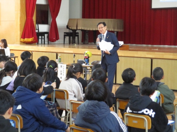 本日は、大牟田市長の関好孝様に講師としてご来校いただき、5,6年生を対象に「まちづくり出前講座」を実施しました。市長からは、大牟田市の産業や名物などを紹介いただき、子供たちは、新たな大牟田市のよさを知ることができました。また、子供たちから質問を受けていただき、これからもっと大牟田市が住みやすく、魅力のある街になるための取組を教えていただきました。市長からは、「夢をもち、努力を続けてほしい。」という子供たちへのメッセージをいただきました。関市長様、本日はお忙しい中、子供たちのためにご来校いただきありがとうございました。