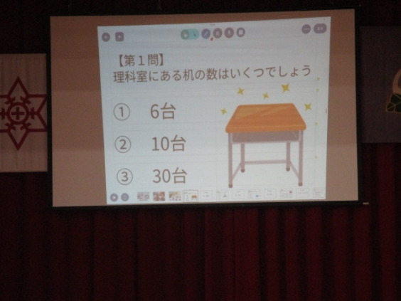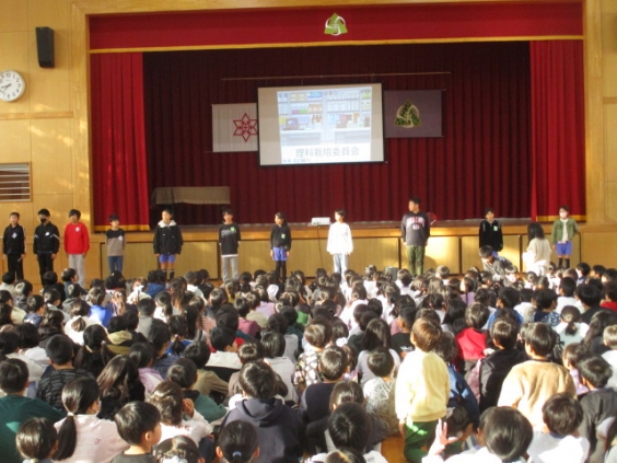 本日は、児童集会を行い、理科栽培委員会が発表しました。発表では、理科栽培委員会の活動の様子や、理科室の使い方などをクイズ形式で紹介しました。