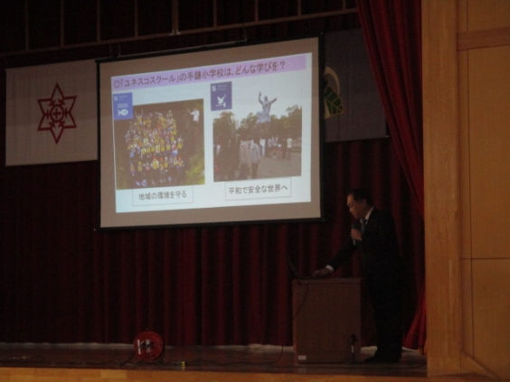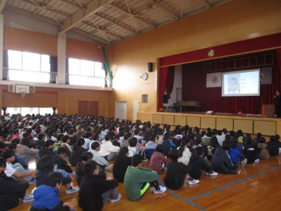 大牟田市では、1月17日をユネスコスクールの日と制定しています。そこで、本校では、16日の朝の時間に、ユネスコスクール記念集会を実施しました。体育館に、これまでの学習の成果を掲示し、教頭先生からユネスコスクールの意義や、ESD、SDGsについて話をしてもらいました。