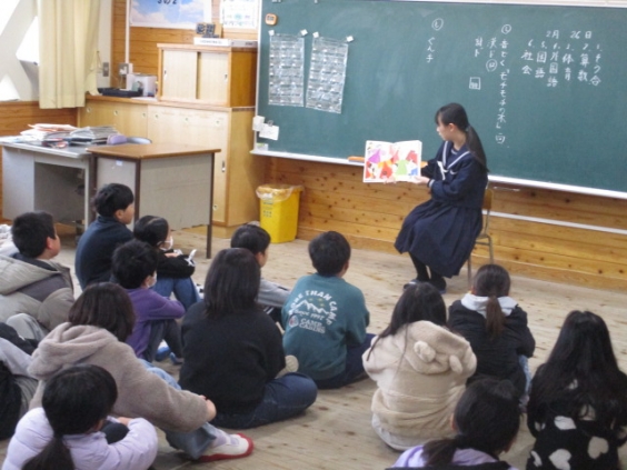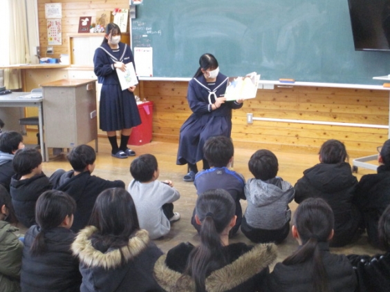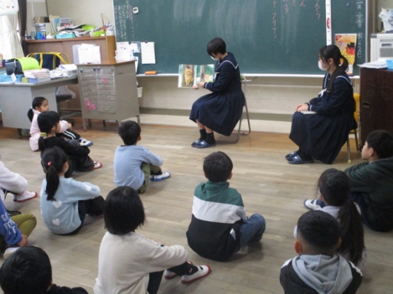 今日の朝の時間は、甘木中学校の生徒の皆さんに、読み聞かせを行ってもらいました。中学生から本を読んでもらい、子供たちはとても真剣に、そして楽しそうにお話を聞いていました。甘木中学校の皆さん、ありがとうございました。