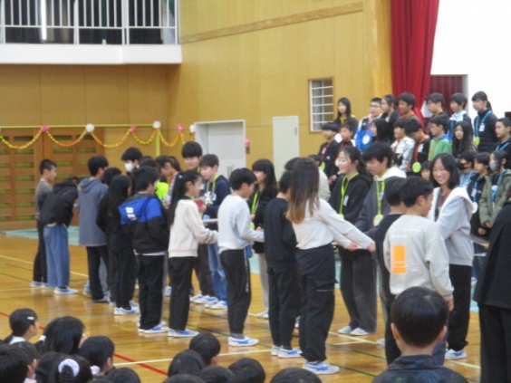 本日は、お別れ集会と遠足の予定でしたが、雨天のため遠足を中止しました。お別れ集会では、各学年から感謝の言葉を6年生に伝えました。6年生からは、これから頑張ってほしいことを1年生から5年生に伝えてもらいました。その後は、体育館でゲームをしたり、縦割りグループで教室で遊んだりして楽しく過ごしました。6年生と過ごすのも、あとわずかとなりました。楽しい思い出をたくさんつくってほしいと思っています。