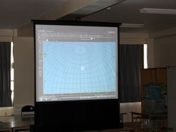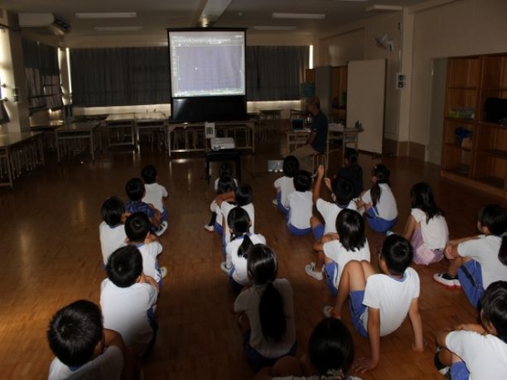 4年生は、理科の学習で月の動きや秋の空について学んでいます。 今日は、多目的室を秋の夜空のように暗くして、月や太陽の動きをICT機器を使って確認しました。 月が時間を追うごとにどのように移動するのかを、スクリーンに映し出された月の動きをもとに藤岡先生から説明していただきました。 とても分かりやすく教えていただいたので、月や太陽の動きに興味を持ったようでした。